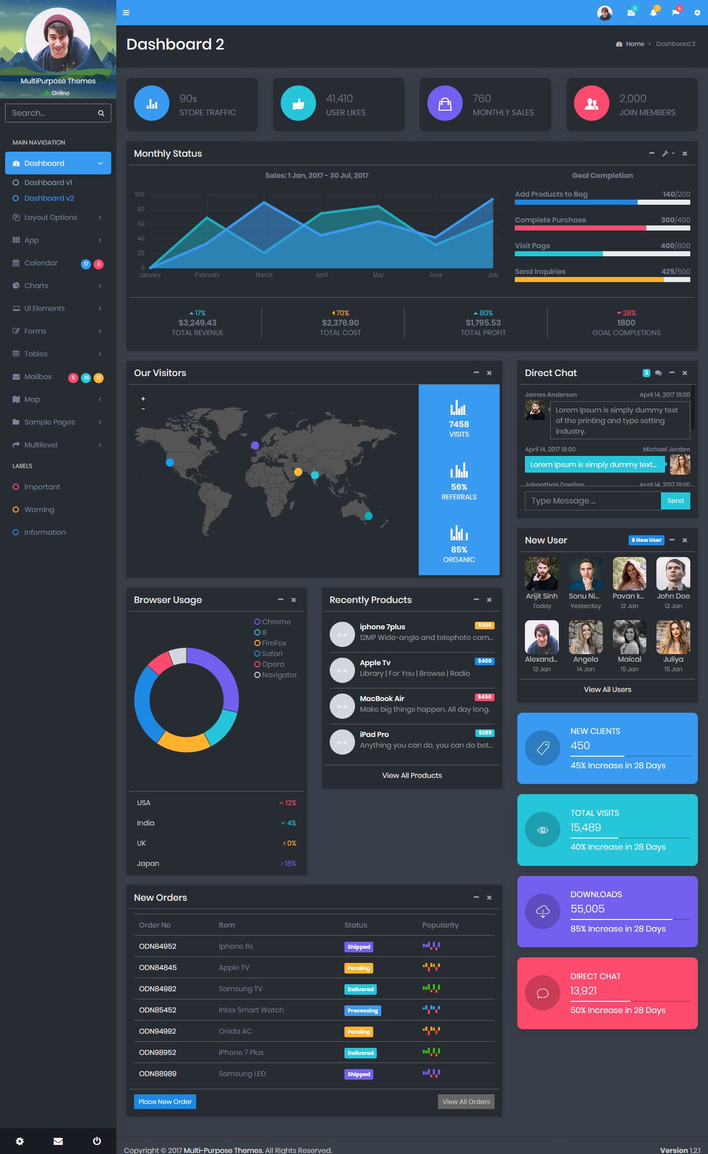 Minimo Pro Bootstrap Admin Templates comes with Dashboard v2.It includes Store traffic, user likes, monthly sales, join members, monthly status, our visitors, direct chat, new user, browser usage, recently products, new clients, total visits, downloads, direct chat, and new orders