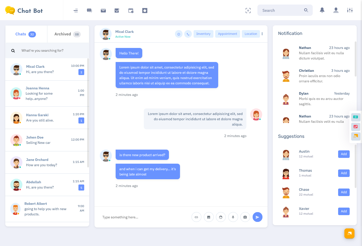 Chatbot UI Kit Examples help developers understand how chat layouts can be structured efficiently. These examples showcase different message styles, chat layouts, user status indicators, and conversation flows. A Chatbot Dashboard inspired by UI kit examples ensures visual consistency and usability across all sections.