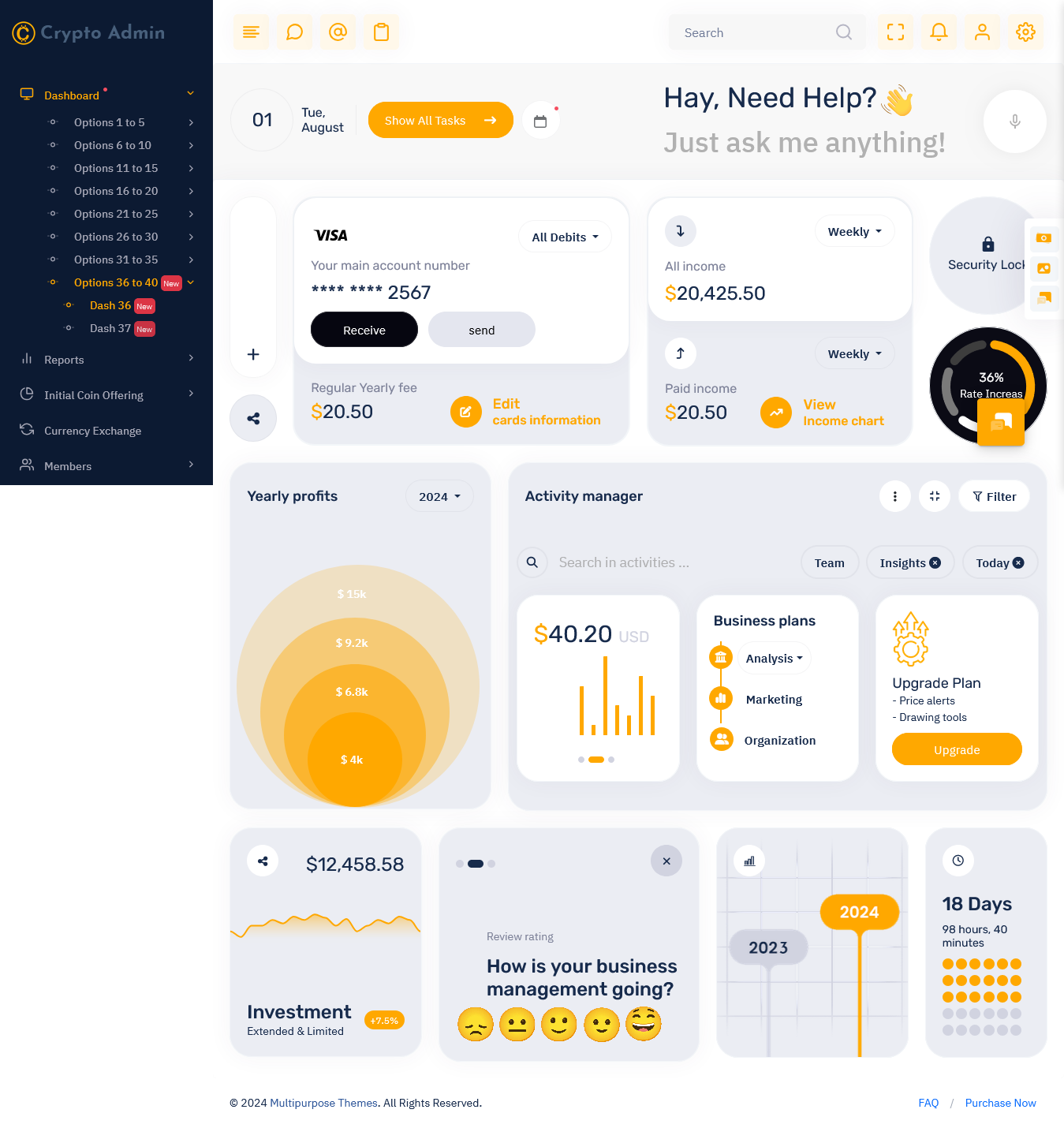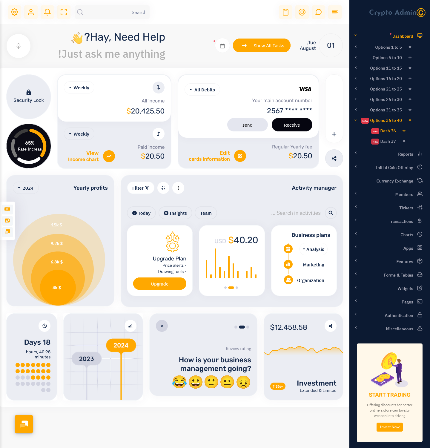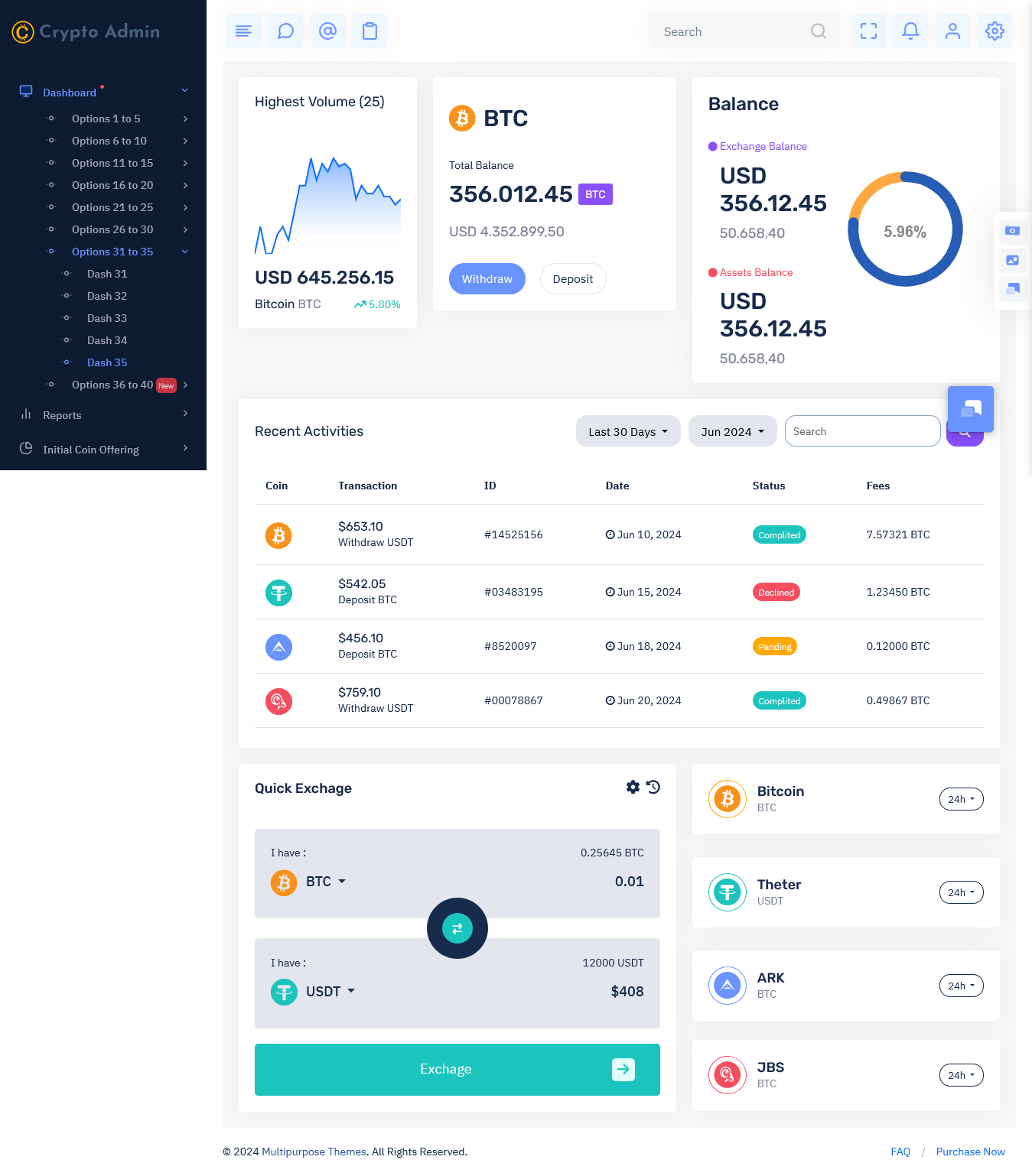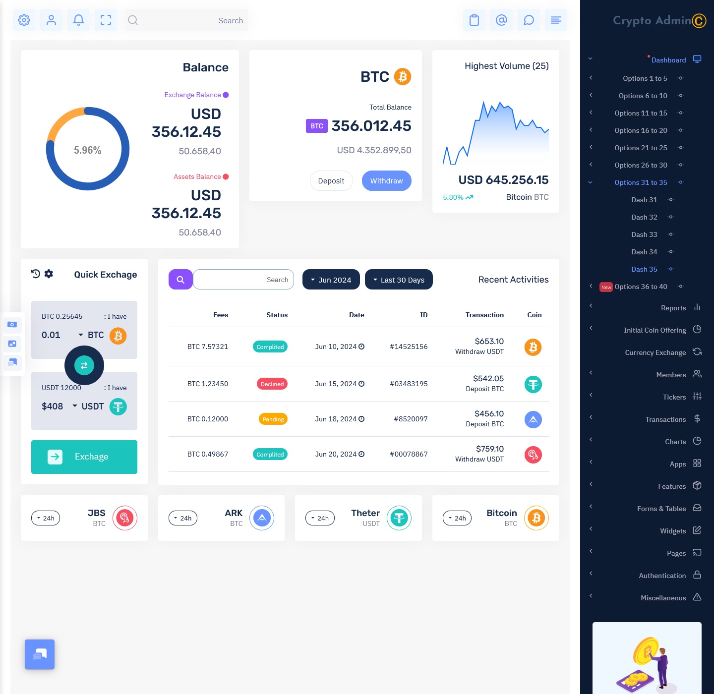 In summary, the Crypto Admin Template is an indispensable resource for anyone involved in cryptocurrency management. With its 34 unique dashboard designs, RTL support, and flexible layouts, it caters to a diverse range of users and preferences. The addition of three new advanced dashboards—Exchange, Reports, and Transaction—enhances its functionality and provides users with the tools they need to thrive in a competitive market.
