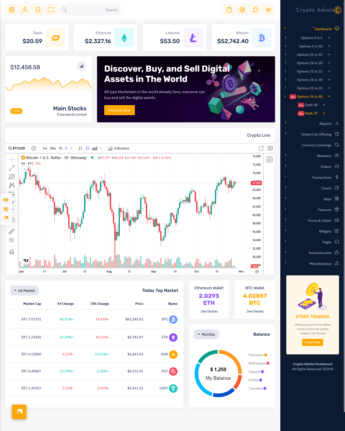 Whether you’re a trader, a business owner, or an analyst, the Crypto Trading Dashboard offers a comprehensive solution that simplifies cryptocurrency management and empowers users to make informed decisions. Embrace the future of crypto management with our state-of-the-art dashboard template and take your cryptocurrency operations to the next level.