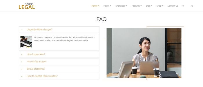 Divine Pro Legal Premium Html Template Come with FAQ pages.