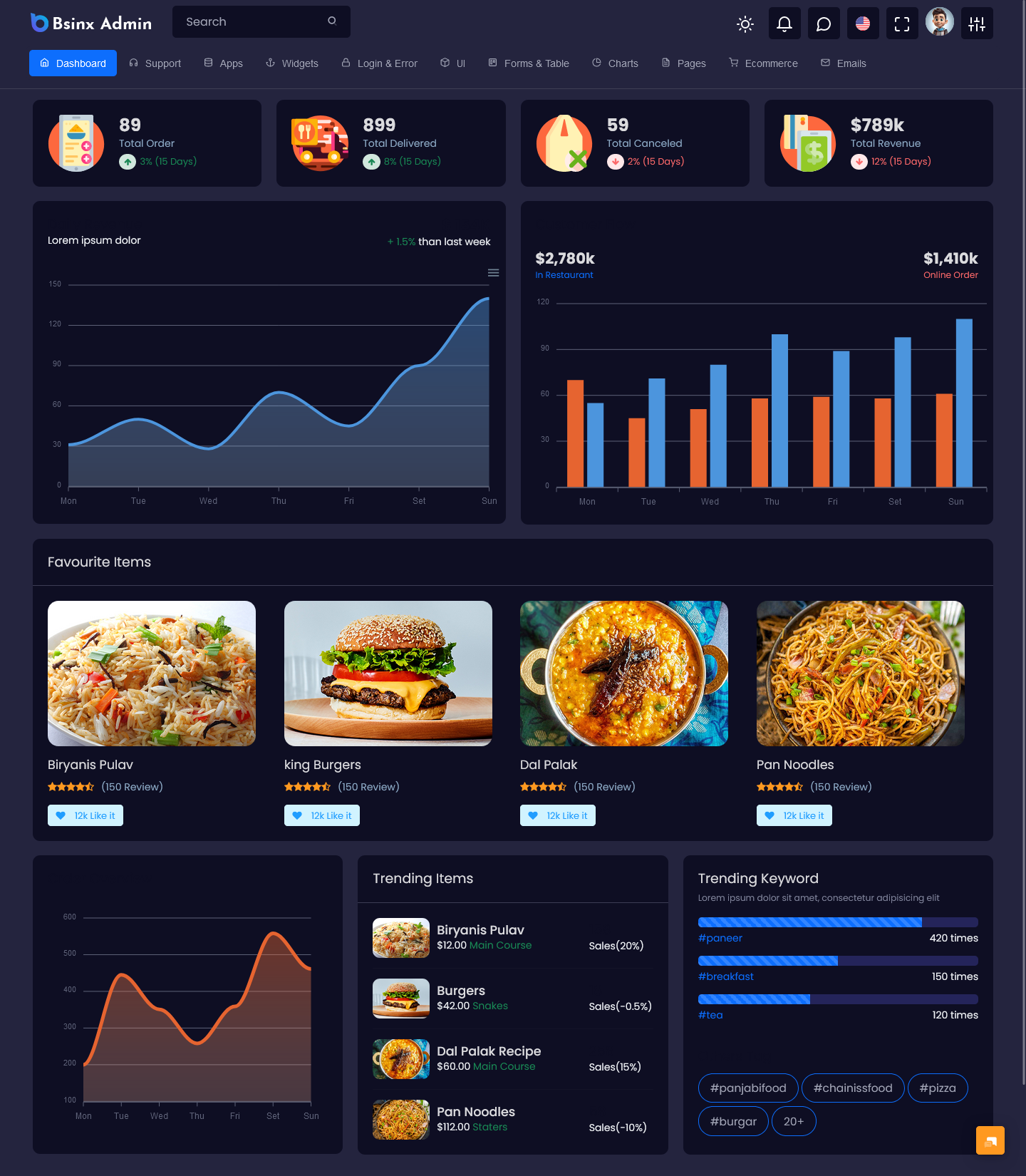 For restaurant managers, keeping track of orders, inventory, staff, and customer service is essential. The Restaurant Dashboard provides a central hub to manage all these tasks. You can track real-time orders, monitor inventory, and ensure customer satisfaction. The UI Dashboard helps improve operational efficiency by allowing managers to easily access sales data, employee schedules, and more.