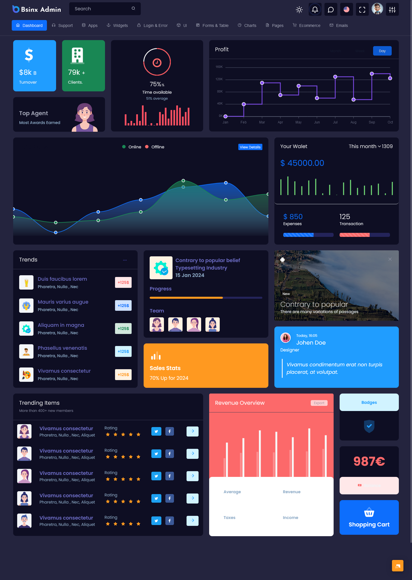 A CRM Dashboard helps businesses manage customer relationships by tracking leads, sales, and customer support tickets. This section makes it easier for sales teams to follow up with leads, track performance, and provide personalized customer service. With the UI Dashboard, you can customize views and track communication history, all while forecasting sales potential. The Bootstrap Admin Theme ensures a clean and responsive design.