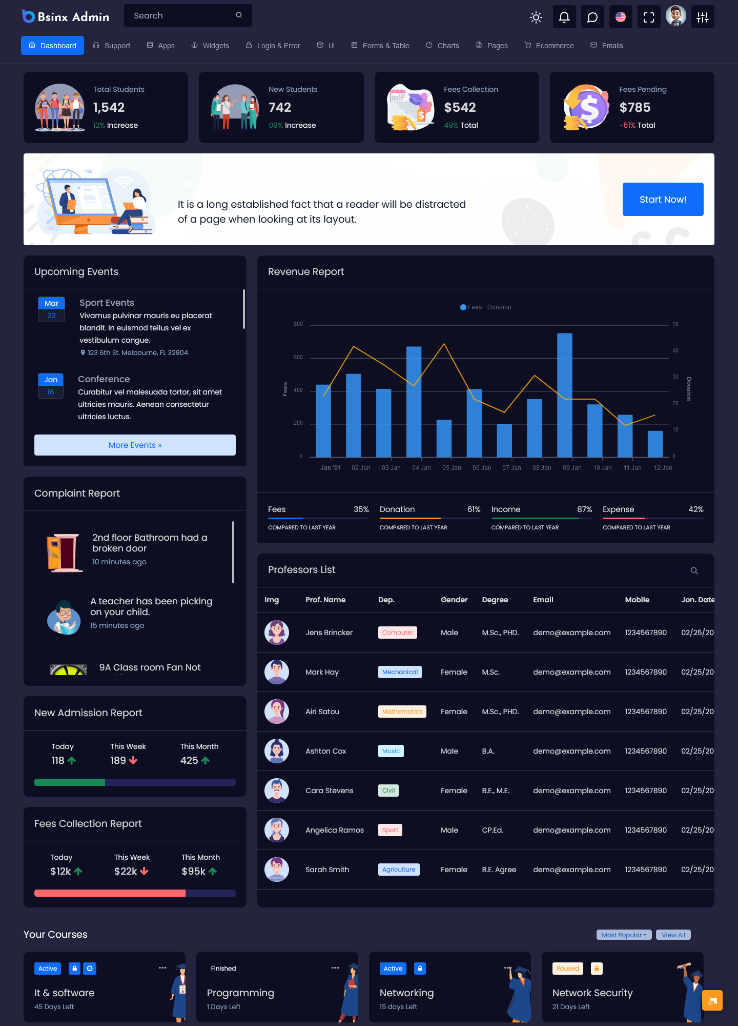 Schools and educational institutions need to manage student data, grades, attendance, and schedules. The Education Dashboard helps you handle all these tasks in one place. Teachers and administrators can easily track student progress, manage courses, and communicate with parents. This Dashboard Template ensures smooth operations and better communication between students, teachers, and staff.