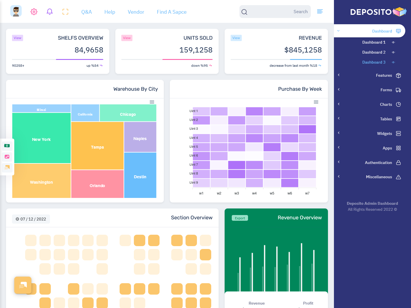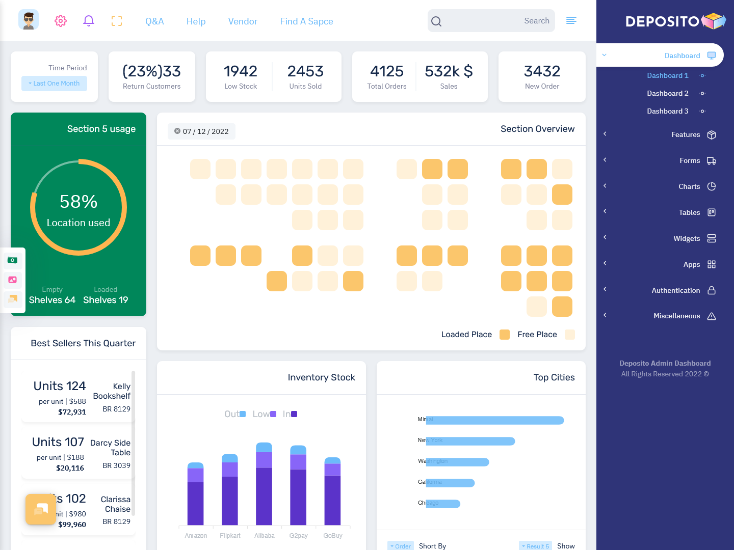 A Deposito Warehouse Admin is a comprehensive Inventory Management Dashboard designed to help businesses efficiently manage their warehouse operations. It integrates key performance metrics, real-time tracking, and detailed analytics in an easy-to-use interface. This particular Dashboard Template offering 3 stunning Warehouse Management Dashboard comes with RTL (Right-To-Left) support and Dark Mode, making it a versatile and modern tool for any warehouse or logistics business.