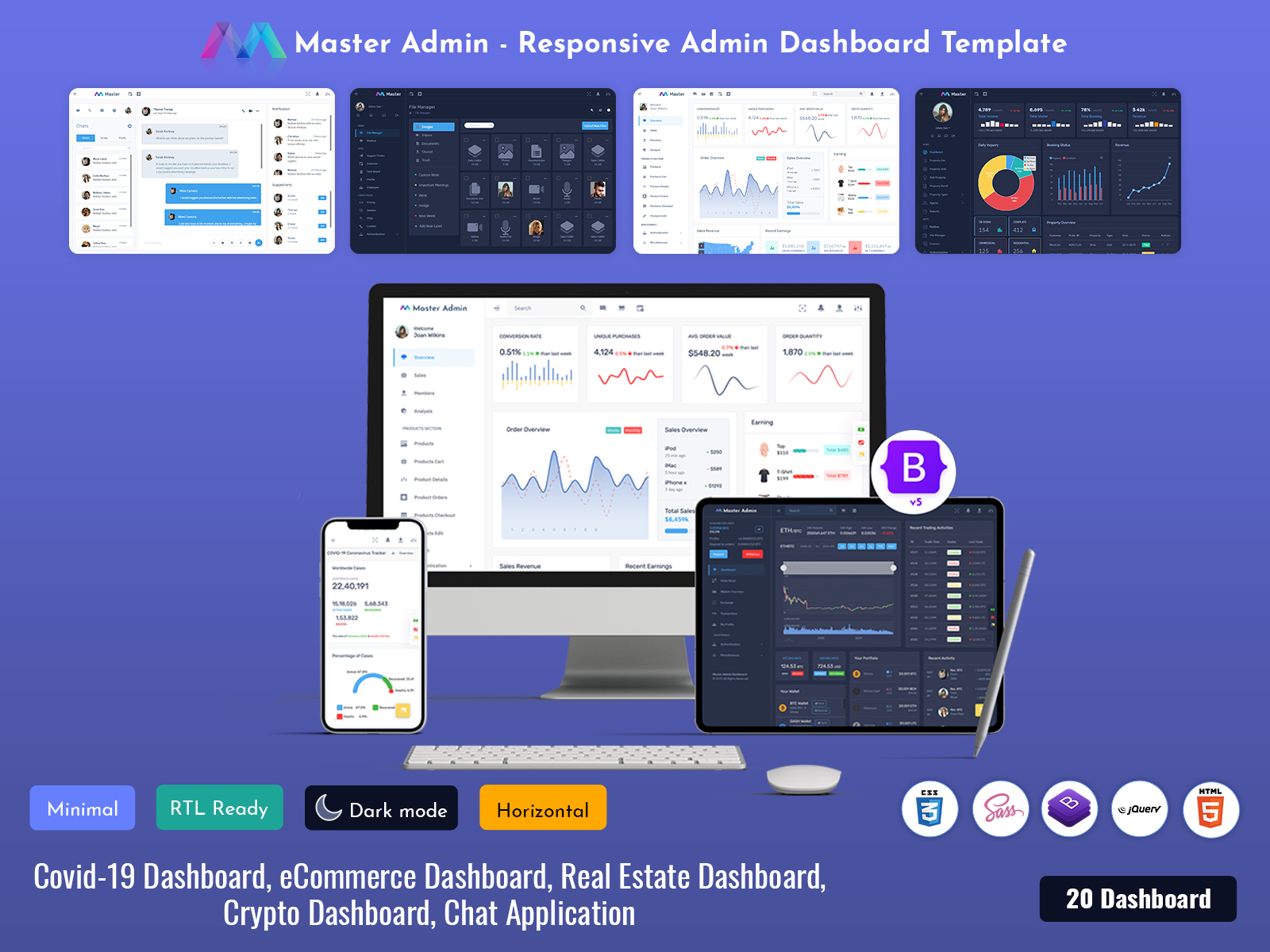 These dashboards include Travel, Chat, Covid 19, Crypto, eCommerce, File Manager, Mailing, Real Estate, and Subscription. Each dashboard has its own design theme, widgets, and data structure. This makes the template more versatile and practical.